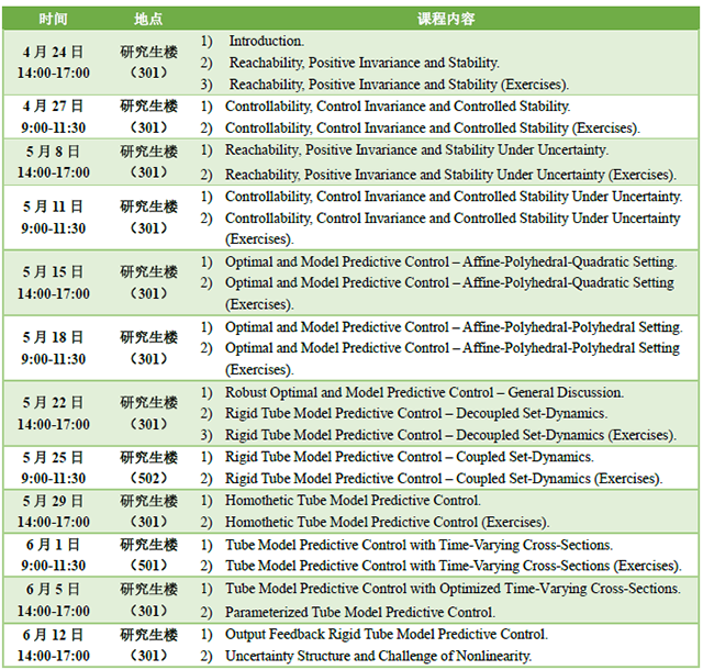 为对标国际顶尖高校,加快“双一流”建设步伐,18小说 特邀控制科学与工程领域知名专家Saša V. Raković教授于4月24日至6月12日期间在18小说 开设前沿控制理论公开课。该课程为我校第二期来华留学英文授课品牌课程《随机过程理论及应用》的选修模块,课程内容涵盖模型预测控制,鲁棒模型预测控制等前沿控制理论。课程主要面向研究生和高年级本科生,欢迎感兴趣的同学参加。具体开课时间、地点和课程内容安排如下: