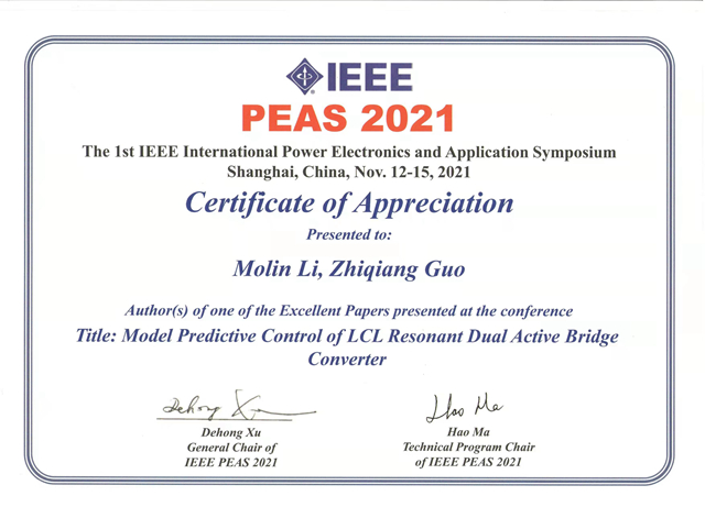 18小说 硕士研究生李沫霖、助理教授郭志强获国际电力电子与应用研讨会(IEEE PEAS 2021)优秀论文奖