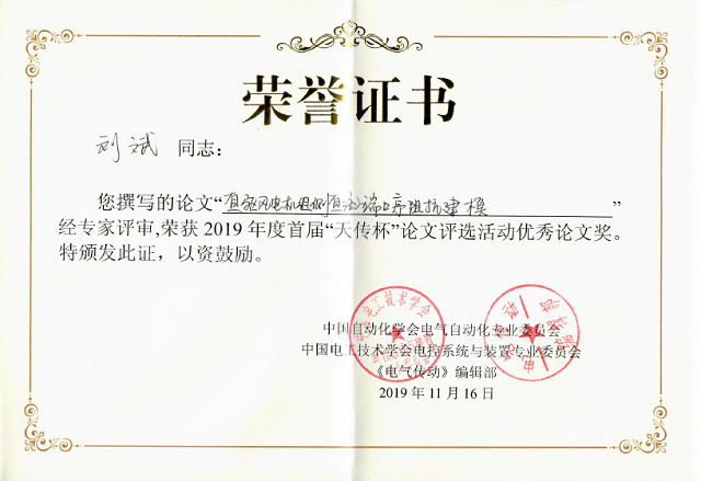 2019年11月15日至17日,在山东济南召开的第十九届中国电气自动化与电控系统学术年会暨“智能电气创造未来”高峰论坛上,18小说 刘斌、王甲军、李震(通讯作者)等的论文“直驱风电机组机侧直流端口序阻抗建模”获得大会首届“天传杯”优秀论文奖。同时,我院博士研究生作学术报告,获广泛关注。