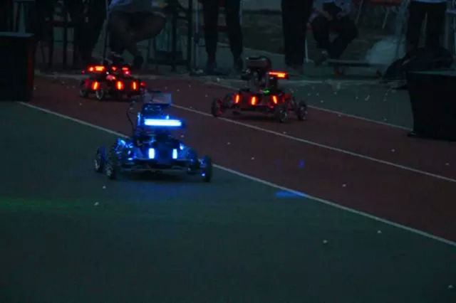 降临的夜幕并没有遮掩队员们的热血与激情,一辆辆战车在场内走位、射击,机器人身上的血量显示板和发射的红绿光线也越发的清晰,整个赛场变成了五彩缤纷的光影世界,绚丽多彩,热闹非凡。比赛现场气氛热烈,围场内机器人大战硝烟四起,机器人灵活的“漂移”和精准的射击,操控手们都在聚精会神、全力以赴,观众则在两位解说员幽默风趣的讲解下看的津津有味,呐喊声响彻赛场。