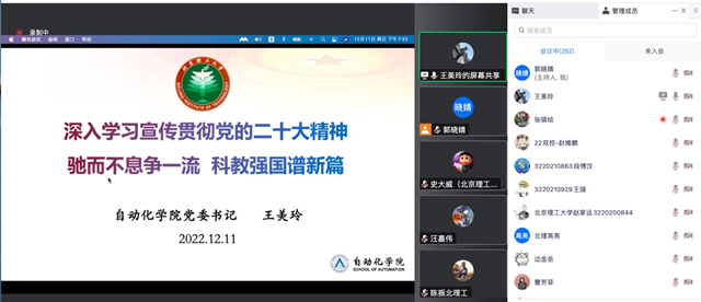 为推动党的二十大精神学习宣传贯彻走深走实,引导全体师生切实把思想和行动统一到大会精神上来, 按照学校党委工作部署要求,12月11日晚,18小说 党委书记王美玲讲授专题党课暨党的二十大精神主题宣讲。全体教工党支部书记,2022年新入职教职工,机关、电子教工党支部教师以及2021级、2022级硕士党支部学生参加学习。会议由党委副书记、副院长史大威主持。
