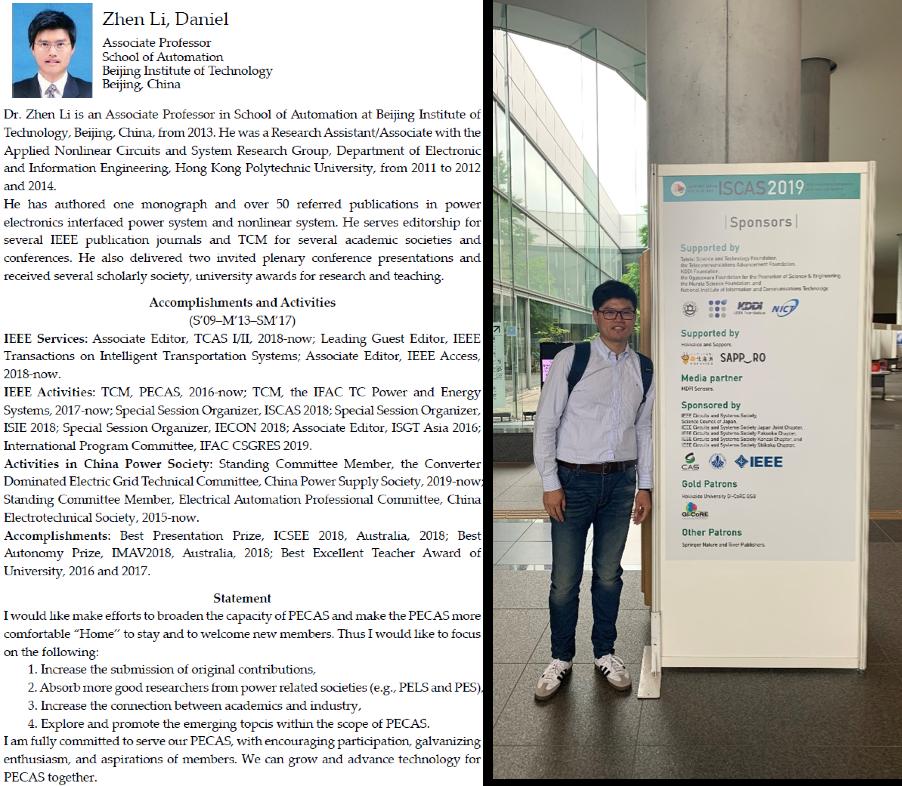 2019年5月25日至29日,18小说 青年教师李震副教授出席于日本札幌举行的IEEE电路与系统学会旗舰会议ISCAS2019(IEEE International Symposium on Circuits and Systems)。与会期间,通过IEEE电路与系统学会执行主席提名,学会旗下两大期刊编委会(IEEE Transactions on Circuits and Systems I/II)与能源专委会统一投票,李震副教授成功当选IEEE电路与系统学会能源专委会(PECAS)候任主席(Chair Elect,2021年至2022年),并将于2022年至2023年直接升任总主席,上任后将成为IEEE PECAS三十年历史上第一位来自中国大陆地区的总主席。在2020至2023的四年中,李震副教授将负责IEEE电路与系统学会能源专委会全球事务的管理与推广,并统筹专委会、学会期刊能源领域的发展方向。