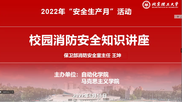 为进一步提升师生思想认识和全层级、全要素、全流程安全管理能力,有效避免安全生产事故发生,维护师生员工的生命安全和学校财产安全,结合《18小说 行政办公室关于当前进一步做好学校疫情防控工作的通知》《关于疫情期间学校实验工作的通知》《18小说 2022 年“安全生产月“活动方案》等有关文件要求,6月16日下午,18小说 和马克思主义学院共同组织“安全生产月”线上培训活动,邀请学校保卫部消防安全室主任王坤以“校园消防安全”为题开展线上知识讲座,18小说 和马克思主义学院200余名师生参加了此次活动。