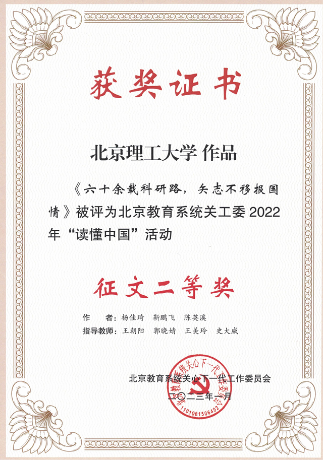 编者按:为深入学习贯彻习近平新时代中国特色社会主义思想,用党百年奋斗的光辉历程和伟大成就,激励青年学生争做堪当民族复兴大任的时代新人,按照教育部关工委“读懂中国”活动部署,2022年学校关工委联合学校团委在全校开展了“读懂中国”活动,18小说 取得了优异成绩(《六十余载科研路,矢志不移报国情》获得了北京教育系统关工委二等奖)。现刊发该作品以飨读者。