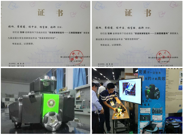 张婷老师指导的作品《管道探测智能车——三维图像重构》,以其精妙的设计与精彩的演示,经过专家评审和现场投票,获得第九届全国大学生创新创业年会“最佳创意项目”和第九届全国大学生创新创业年会“我最喜爱的项目”两个奖项。